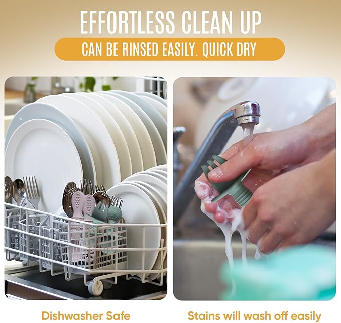 - Limpieza sin esfuerzo: hecho de material de silicona de grado alimenticio de alta calidad, nuestro juego de alimentación de silicona para bebés es muy fácil de limpiar y no dejará manchas. Simplemente, coloque el juego en el lavavajillas y saldrán limpios y desinfectados. Estas cucharas y tenedores para niños pequeños también son ligeras y fáciles de sostener, por lo que son perfectas para comidas sobre la marcha.