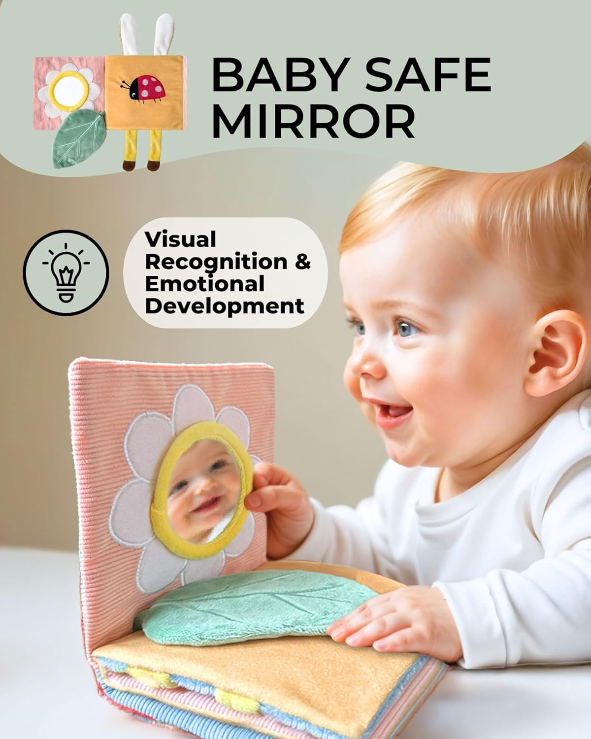 - Desarrollo sensorial temprano: nuestro adorable libro sensorial suave para bebés estimula la vista, el tacto y los sentidos auditivos. Los elementos interactivos, los sonidos arrugados y las texturas tocables, fomentan el aprendizaje temprano.